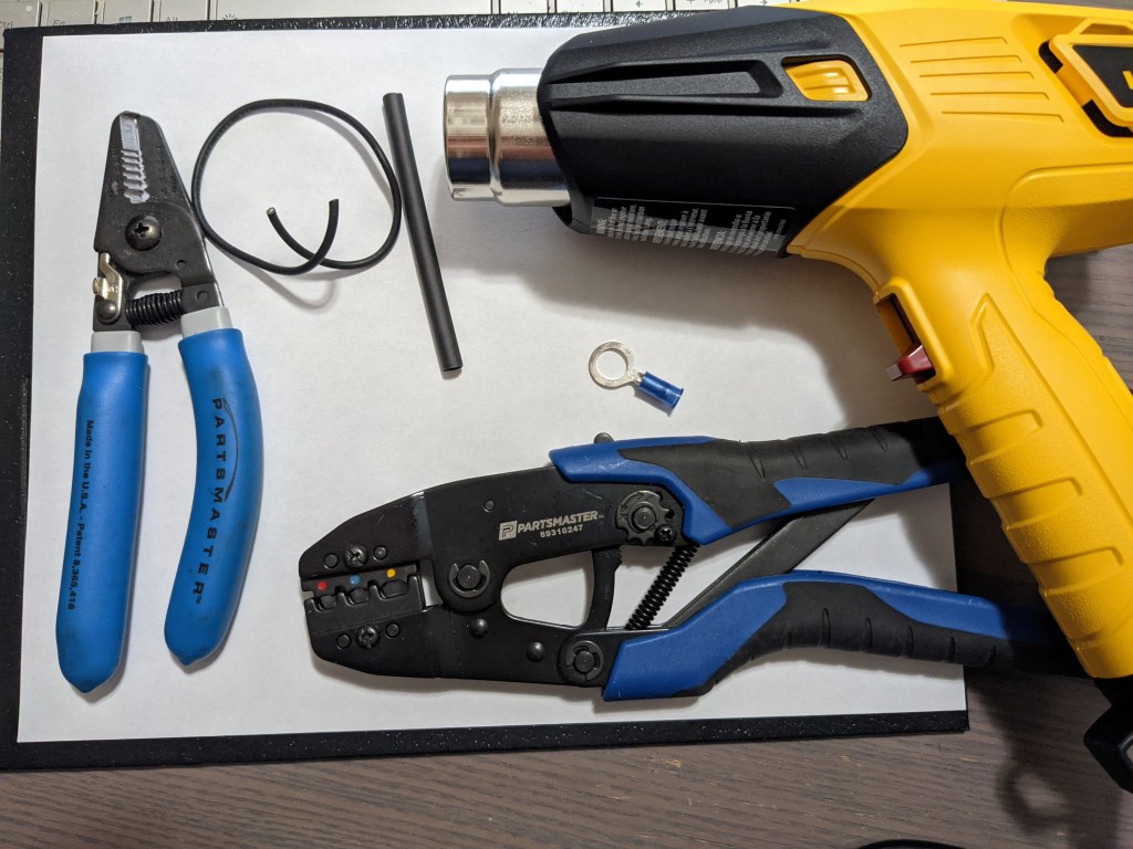 The antenna was constructed using 18 AWG crosslink primary wire, wire stripper, crimper, 18 AWG ring connector, 3:1 marine grade heat shrink, and a heat gun.